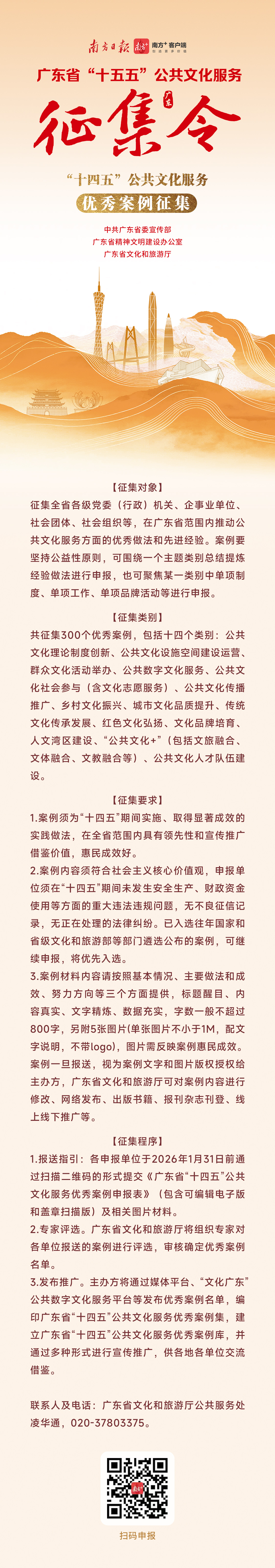 答:不复杂!2026年1月31日前,通过南方+、“文化广东”平台等渠道扫码就能提交材料。需要填写申报表,附上案例或主体介绍、图片等佐证材料。二维码就在征集令里,轻松扫码、一键参与!