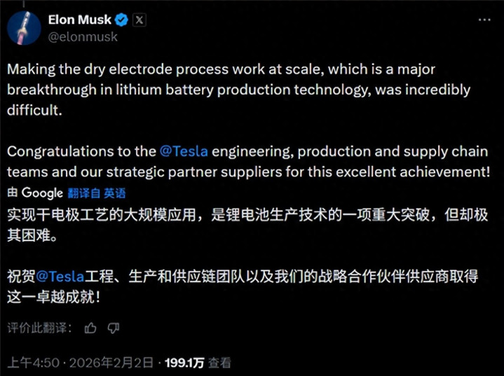 马斯克在X平台上写道:“实现干电极工艺的大规模应用,是锂电池生产技术的一项重大突破,但却极其困难。祝贺@Tesla工程、生产和供应链团队以及我们的战略合作伙伴供应商取得这一卓越成就!”